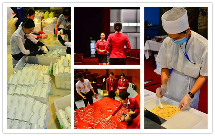 我院学生为会场上唯一入选接待的高校团队,负责前厅、宴会部、会展部、营销部、厨房等核心岗位,其中13名同学接受严格的专业培训,负责会议主席台VIP接待。