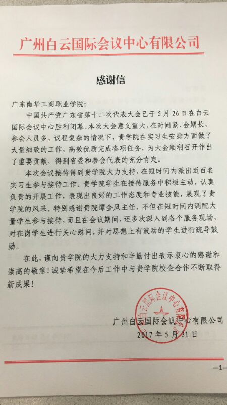 白云国际会议中心有限公司党委邬永强书记接见旅游管理系谭金凤副主任一行老师时,明确表示:“南华学生是以往所有的合作院校学生中最优秀的!”党代会结束后,企业向学校发来了感谢信:“贵学院在实习生安排方面做了大量细致的工作,高效优质完成各项任务,为大会顺利召开作出了重要贡献,得到省委和参会代表的充分肯定。”