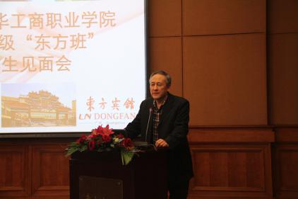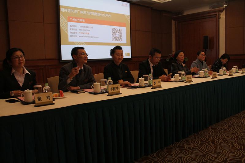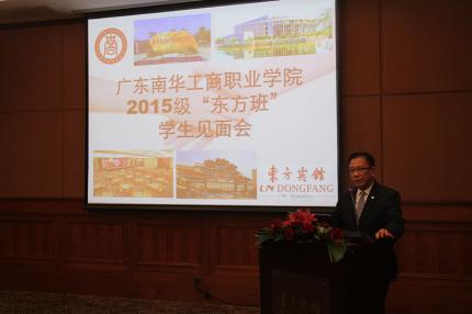会议由2015届东方班学生陈艳颜(现于人力资源部培训部工作)主持。首先由郭记中副院长致辞,东方宾馆是广东省的老字号,是中国酒店本土品牌的标杆,东方宾馆和学校合作长达五年之久,郭院长表达了几年来企业对我院酒店管理专业人才培养的肯定并对此表示感谢,校企合作平台给予了学生锻炼发展的机会。郭院长寄语在场学生,希望同学们做到:“安其位、尽其责、持以恒、谋共赢”,在东方宾馆的高平台上把握机会,在实习岗位上尽学习的本分,在企业站得住、立得稳。东方宾馆钟耀宗总经理对师生的到来表示热烈欢迎,他介绍了东方宾馆55年的发展历史,分享自己亲身成长的经历,向同学们展示了一个酒店高层管理者都是从一个基层服务员开始,提出了用心学习、勇于进步的期望。