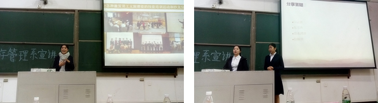 图三、图四:2013级东方班杨文琪以及2014级白云班徐小群、梁静银向师弟妹们分享实习经历