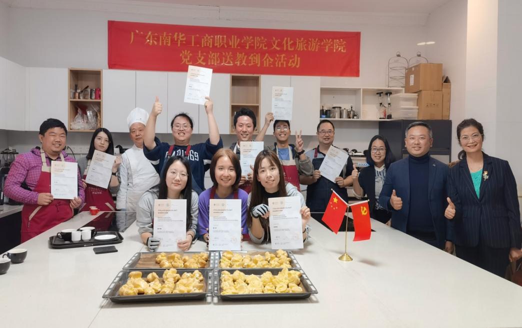 11月11日,文化旅游学院党支部书记谭金凤带领支部党员同志到广州沐辰公司开展烹饪工艺培训活动,学员主要来自沐辰和呜啦啦(广州)科技有限公司听障员工。烹饪工艺与营养专业王晓强老师与学生预备党员烹饪工艺与营养专业詹立忠、施婷婷、郑嘉琳现场展示西点制作、酒水调制等技艺,充分发挥文化旅游专业优势,展示教学专业成果,同时以此为载体为听障人群搭建起无障碍交流平台,丰富企业文化、加强师生员工情感,促进了听障人群与社会群体的沟通交流。