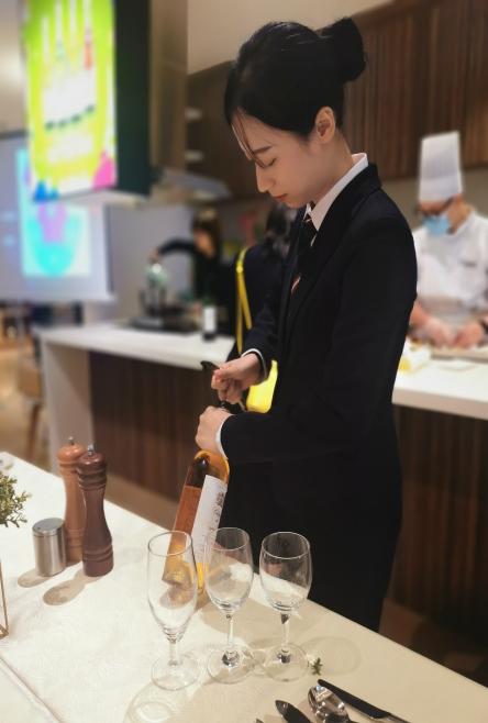 (左:潘家佳为王晓格提供餐厅服务技能比赛西餐服务技术指导 右:王晓格同学为华南师范大学学生提供西餐服务展示)
