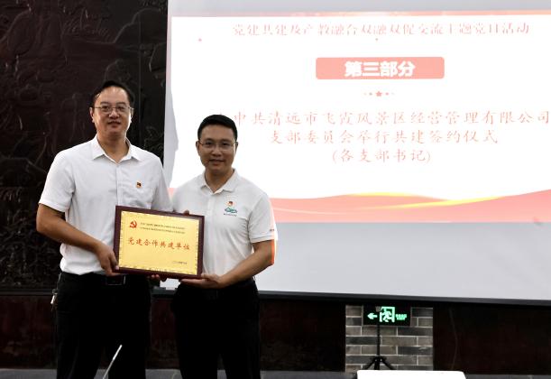 随后,中共广东南华工商职业学院文化旅游学院支部委员会和中共广东南华工商职业学院学前教育学院支部委员会分别与中共清远市飞霞风景区经营管理有限公司支部委员会举行了共建签约仪式。双方表示,将以此次签约为契机,加强党建与业务的深度融合,共同为传承传统文化和发扬清远旅游事业贡献力量,砥砺前行,奋力开创校企合作新局面。