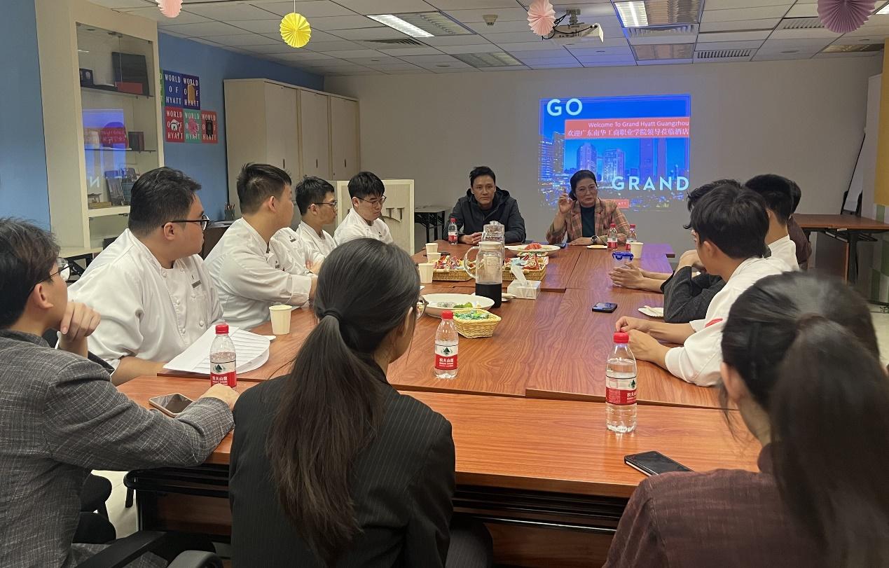 校企双方围绕酒店行业的最新发展趋势、企业对人才的需求变化以及校企合作模式创新等议题展开了讨论。学院教师与君悦订单班学生开展座谈会,了解学生在岗学习、生活状况,并针对酒店行业的特点为学生做职业生涯发展规划指导。