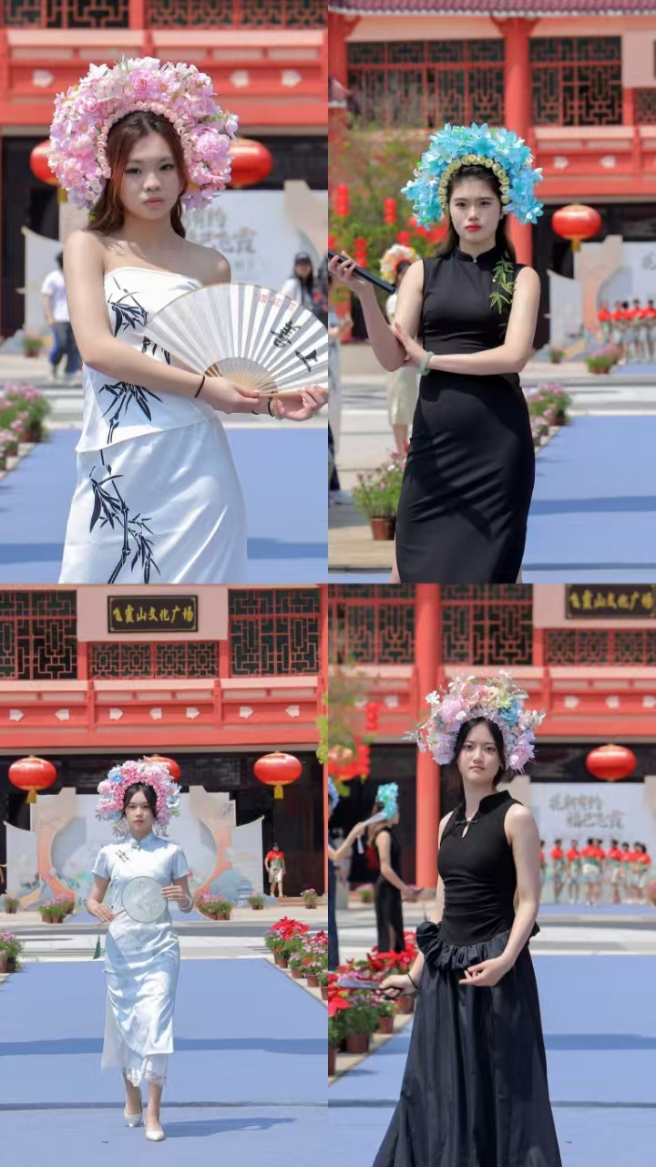 花朝节源于春秋,兴于唐宋,承载着祭花神、赏红踏青的千年文脉。本届活动以“花朝有约,福巳飞霞”为主题,在清远市旗袍协会《盛世芳华》古装秀中拉开序幕。十二花神巡游祈福、编钟古乐《步步高升》、非遗技艺展演等节目精彩纷呈。其中,我校模特社带来的新中式簪花时尚秀尤为亮眼——传统纹样与现代剪裁相映成趣,南华学子以创新设计诠释文化自信,为现场观众带来强烈的视觉冲击。