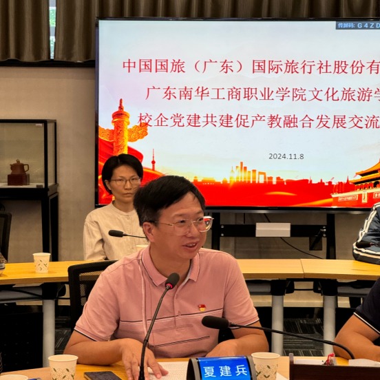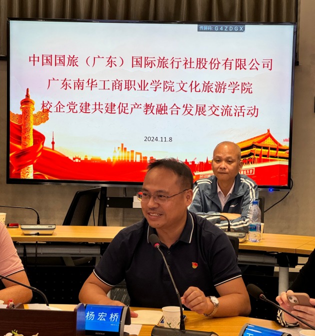 11月8日下午,化旅游学院中国国旅(广东)国际旅行社股份有限公司在清远校区图书馆圆桌会议室开展党建引领深化产教融合,共谋旅游行业新发展”为主题的党建共建业务交流活动,旨在通过党建促进深层次合作推进高质量产教融合发展,激发校企合作创新活力和内生动力。中国国旅(广东)国际旅行社股份有限公司副总经理杨宏桥人力资源部总经理王文燕校企合作专家顾问江苏省产业教授盛彧彧文化旅游学院党支部书记夏建兵、副院长谭金凤、梁滔滔、党支部党员及旅游管理专业老师参加了本次活动。