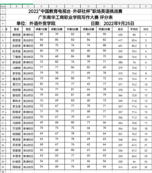 开学伊始,赛事先行,由外院组织的2022“中国教育电视台·外研社杯”英语写作大赛(初赛)于2022年9月19日顺利收官。校内初赛由李海珍老师、张弋老师、谭梅燕老师、张洁楠老师、吴健昭老师担任本次评委。本次比赛共有25人报名参加,角逐争夺3张省赛入场券。