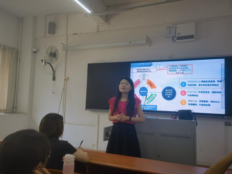 余伟琼在会议中对近期工作进行安排,她就商务英语专业人才培养模式改革进行了系统分析,进一步聚焦行业需求,对接行业和企业的岗位(群),并提出产教融合的可行性方法。专业在面对“职教出海”以及课程如何转向数字化、国际化进行了布局。