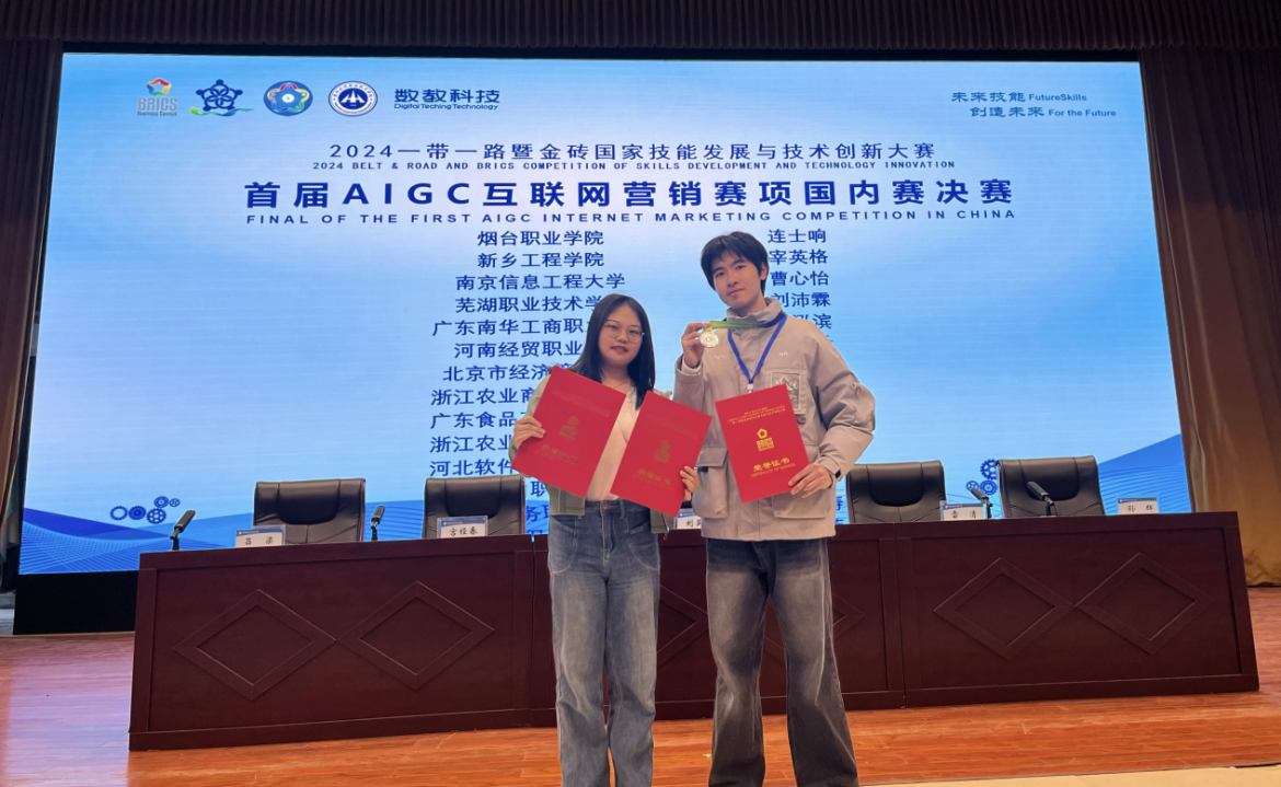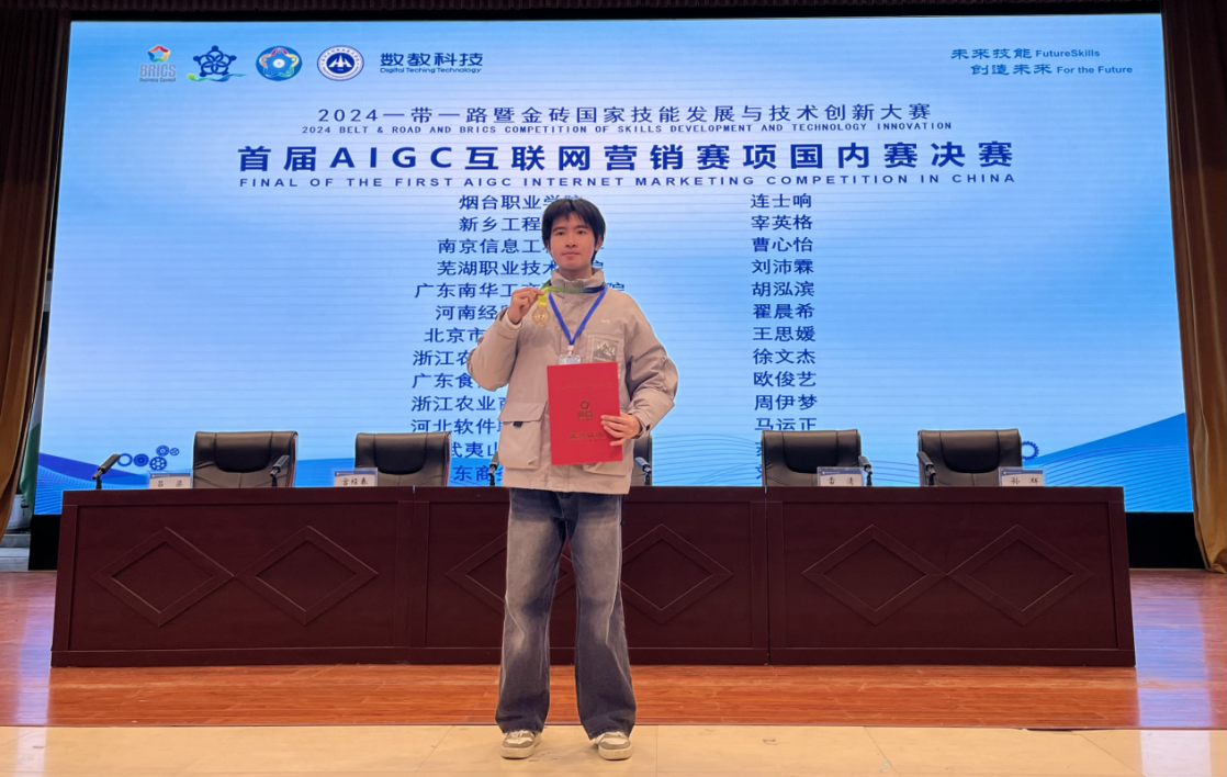2024年11月30日,2024年“一带一路暨金砖国家技能发展与技术创新大赛”首届AIGC互联网营销赛项国内赛决赛在河南省开封市黄河水利职业技术学院圆满落幕。在我校外语外贸学院(下称“外院”)国际贸易与经济专任教师邓雨梦的悉心指导下,外院2023级学生胡泓滨凭借出色表现,荣获国赛二等奖。