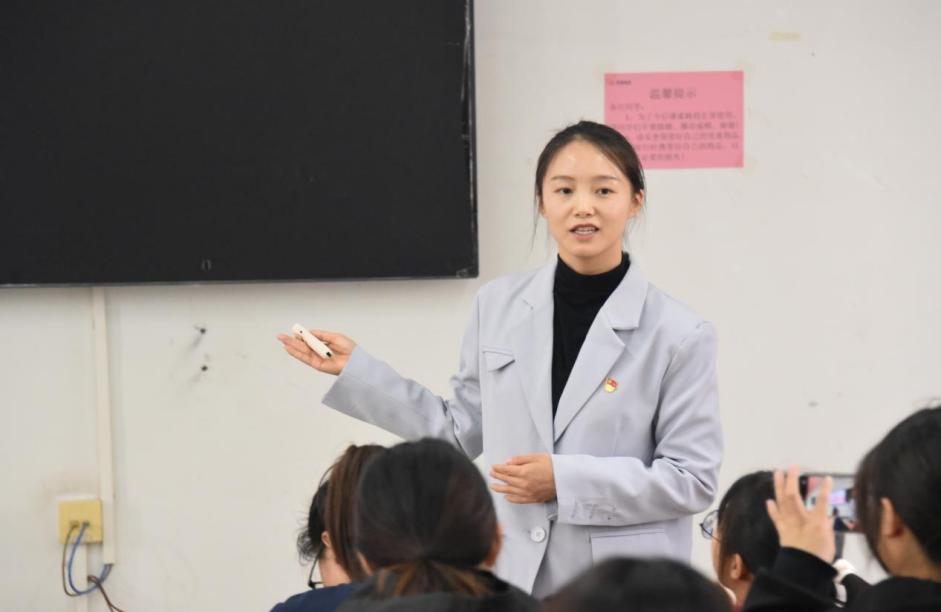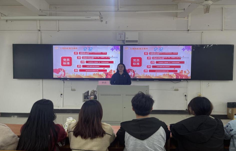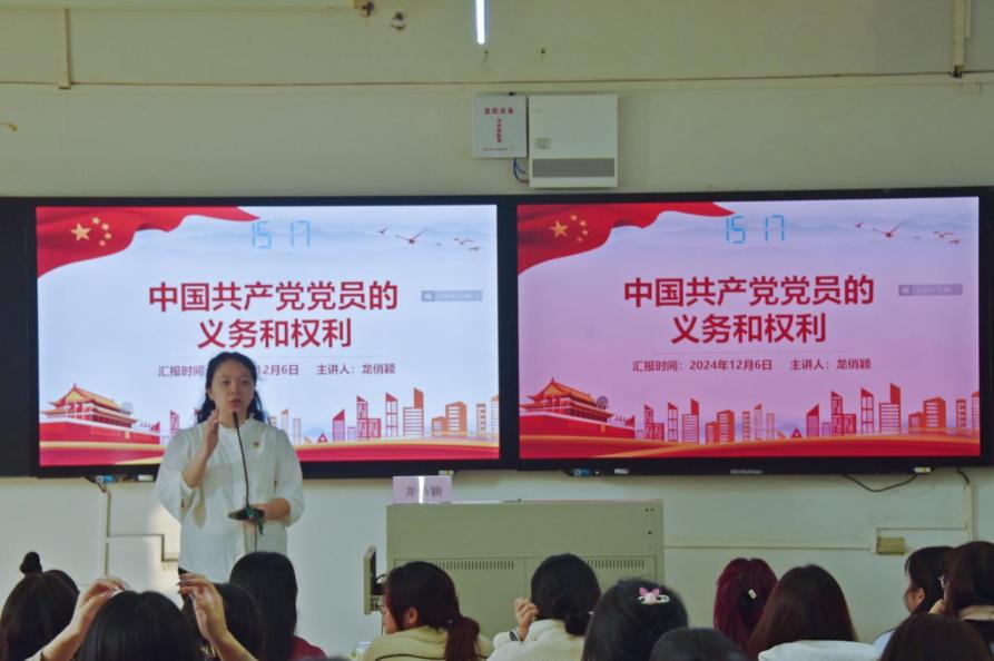 龙俏颖向学生讲解党员的义务与权利、党员权利与义务的关系以及如何坚定理想信念等内容。龙俏颖以自身经历为例子,叮嘱同学们莫负韶华,珍惜时光提升自己,从思想、学习、工作等方面努力提升自己,将个人前途与国家未来相结合,争取做到身未入党,思想先入党。