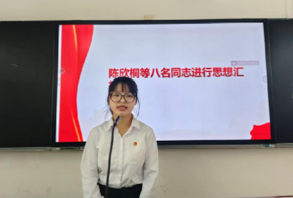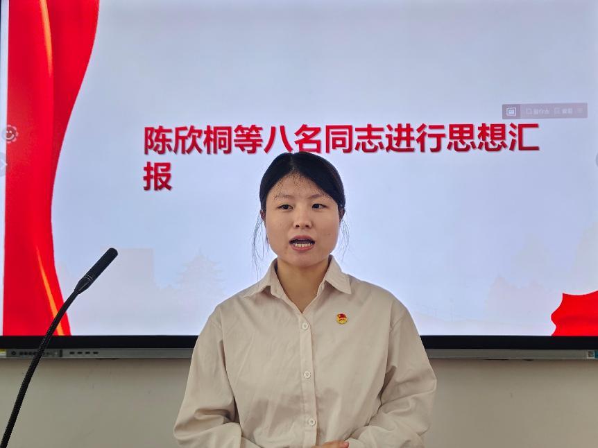 陈欣桐等八名同志围绕对党的认识、入党动机、本人履历、家庭和主要社会关系情况以及需要向党组织说明的问题等方面,依次向党组织汇报个人情况,表达了他们加入中国共产党的强烈愿望,并由入党介绍人对其学习、工作、志愿服务等方面进行评价。参会党员开展讨论,经正式党员无记名投票表决,一致通过接收陈欣桐等八名同志为中共预备党员。