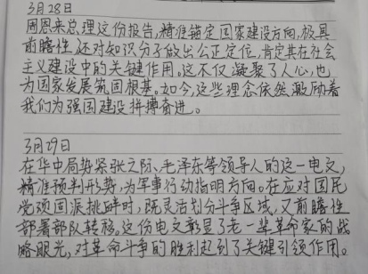 学生们坚持学习并结合时代使命与个人成长撰写心得,共55篇。在深入学习中,学生们有所感悟。学习周恩来在第二届全国人大第三次会议上作《政府工作报告》后,深刻认识到知识分子在社会主义建设中的关键作用,领悟“尊重知识、尊重人才”的战略意义;学习毛泽东在《解放日报》改版座谈会上讲话,明白了批评应该是严正的、尖锐的,但又应该是诚恳的、坦白的、与人为善的。冷嘲暗箭,则是一种销蚀剂,是对团结不利的。