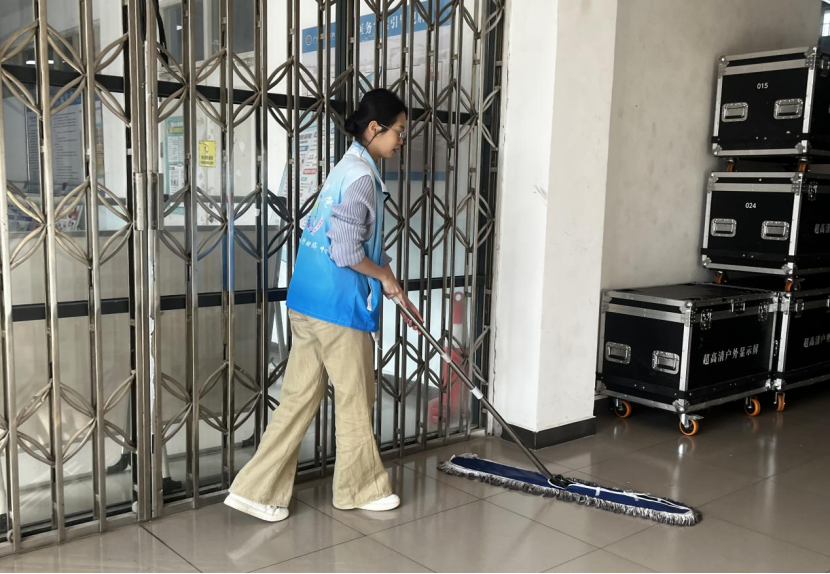 图二志愿者手持清洁工具清洁校园公共区域地面