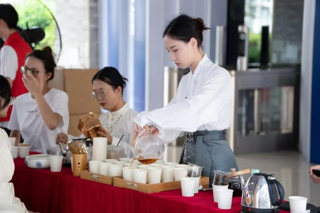 此外,学院安排了茶艺专业的同学们进行茶艺表演,他们身着传统服饰,在迎新现场展示着茶艺的魅力。随着茶香四溢,一杯杯温暖的茶水被递到了奔波忙碌的学生与家长手中,这不仅驱散了他们旅途的疲惫,更传递温情与关怀。另外,学院还设置了“即拍即得”拍照打卡环节,为家长、学生和老师记录下了这个特殊时刻的美好瞬间。打卡墙前的笑脸与合影,不仅定格了新生们踏入大学校园的第一步,成为了他们与家人共同珍藏的记忆,而且也拉近了师生之间的距离,加深了师生情谊。