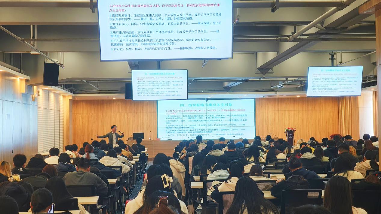 12月4日上午,外语外贸学院(以下简称“外院”)在清远校区图书馆报告厅举办了两场宿舍心理观察员技能培训。学院党总支部副书记刘爱玲、二级心理辅导站副站长赵玉泓以及全体宿舍心理观察员共同参加本次讲座。
