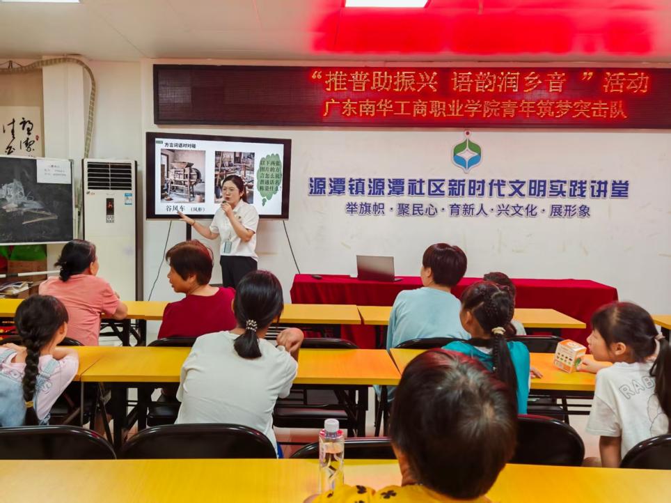 作为教育部2025年“推普助力乡村振兴”暑期实践项目入选团队,突击队以推普助力乡村振兴,开展了一系列推普活动。为让推普更接地气、更暖人心,突击队结合源潭本土文化,创新编制方言与普通话对照表,在深入源潭镇大街小巷调研的同时现场为村民纠正发音;为深化推普成效,突击队在源潭社区新时代文明实践站特邀广东南华工商职业学院副教授郭熙,为社区居民带来“推普+普法”“推普+方言”两场妙趣横生的主题课堂,并采用“线下沉浸互动+线上同步直播”双线模式,吸引众多网友云端参与,在短短一个小时直播间点赞超2万次。此外,突击队还深度挖掘迎咀特色,创作了原创支教歌曲《七月语光》,并精心制作“双语推普陈皮柑”等系列视频,同时还创新性邀请村支书陈记权以“陈皮柑与茶”为视角拍摄推广视频,在茶香氤氲中展现普通话魅力,打造云端文化名片。