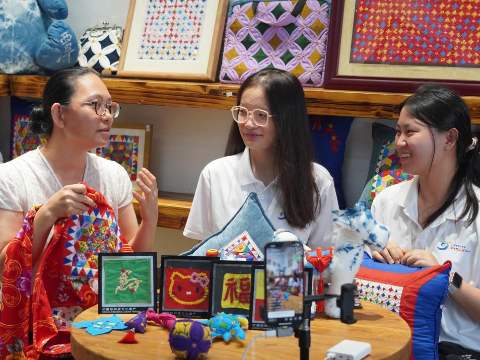 突击队与驻村书记曾燕华在直播间介绍背带绣的故事