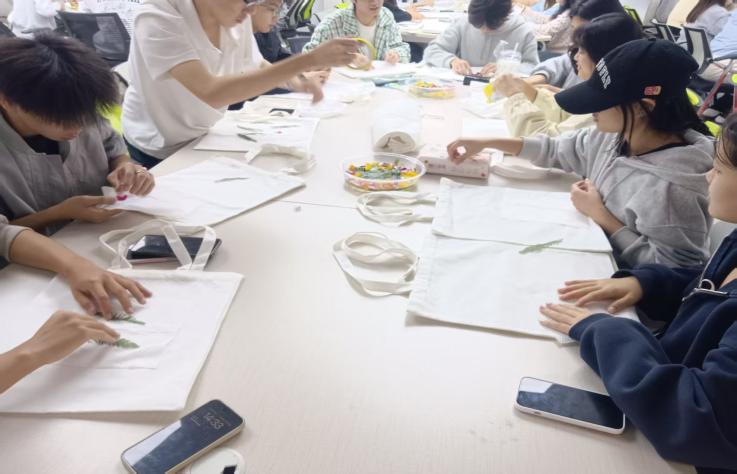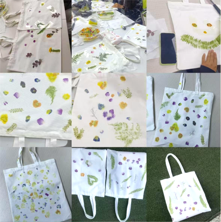 工作人员简明演示了植物拓印的步骤,并备齐了新鲜叶片与拓印工具。现场气氛活跃,同学们迅速投入创作,指尖轻挑花草,在帆布包上构思布局,随着一次次敲拓,叶片的脉络与色彩悄然晕染,化作一幅幅生动自然的“植物画卷”。