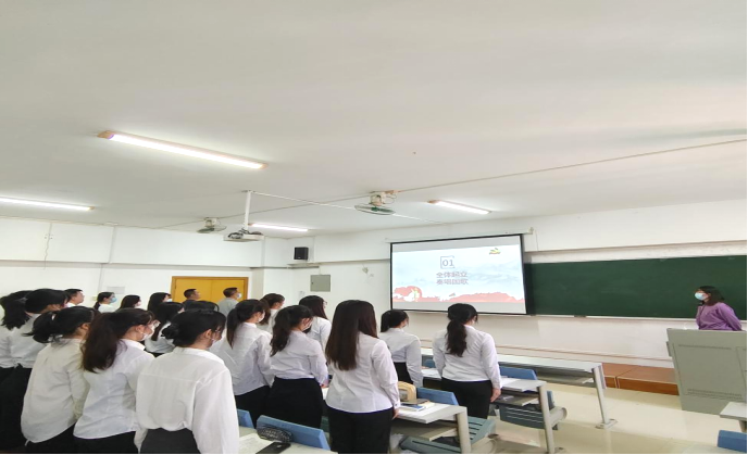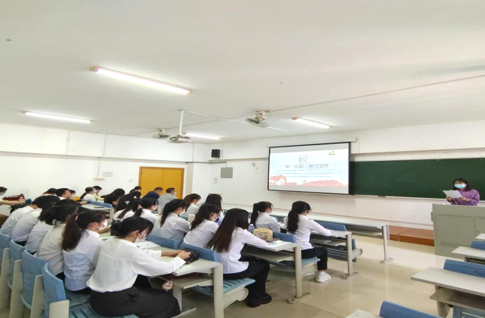第一项议程:全体起立,奏唱国歌《国歌》。随后,汤湘湘同志领学《习近平谈治国理政》第四卷第二十一章:以伟大自我革命引领伟大社会革命:努力成为可堪大用能担重任的栋梁之才、《关于完善高校教师思想政治和师德师风建设工作体制机制的指导意见》两个学习材料。