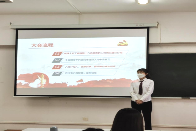 第二项议程:进行中共预备党员通表。首先由主持人汤湘湘对丁嘉琪等十六名同志的入党情况进行介绍;随后丁嘉琪等十六名同志逐一进行入党申请发言,表达了对党组织的教育培养以及入党培养人悉心教导的感谢,并对自己自入党以来学习生活、思想觉悟、实际行动等情况进行汇报,同时认识到自身的缺点和不足,并提出了改善方法。入党培养人、支部党员对每名发展对象进行民主评议。