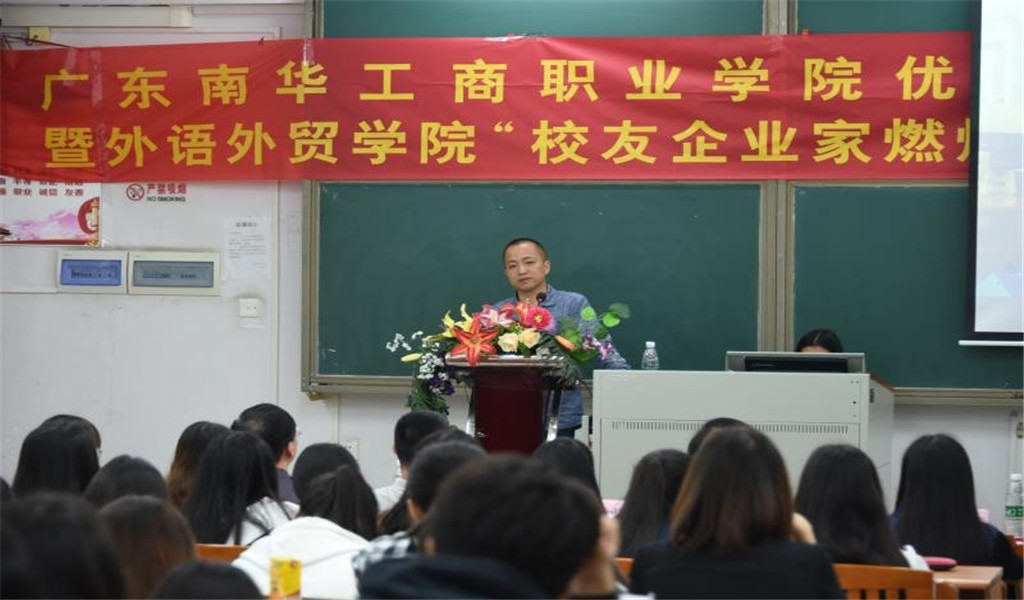 2019年3月27日,广东南华工商职业学院科研处联合外语外贸学院于清远校区教学楼305举办了广东南华工商职业学院优秀校友论坛第1期暨外语外贸学院“校友企业家燃爆青春励志系列演讲”第1期。本次演讲嘉宾是外语外贸学院03级优秀校友刘礼桐(刘礼桐,现任深圳市中远洋国际货运代理有限公司、香港中远洋商贸服务有限公司总经理)。讲座由科研与发展规划处副处长余柱青主持,我院李海珍院长、党总支书记夏建兵等老师以及100多名学生听取了讲座