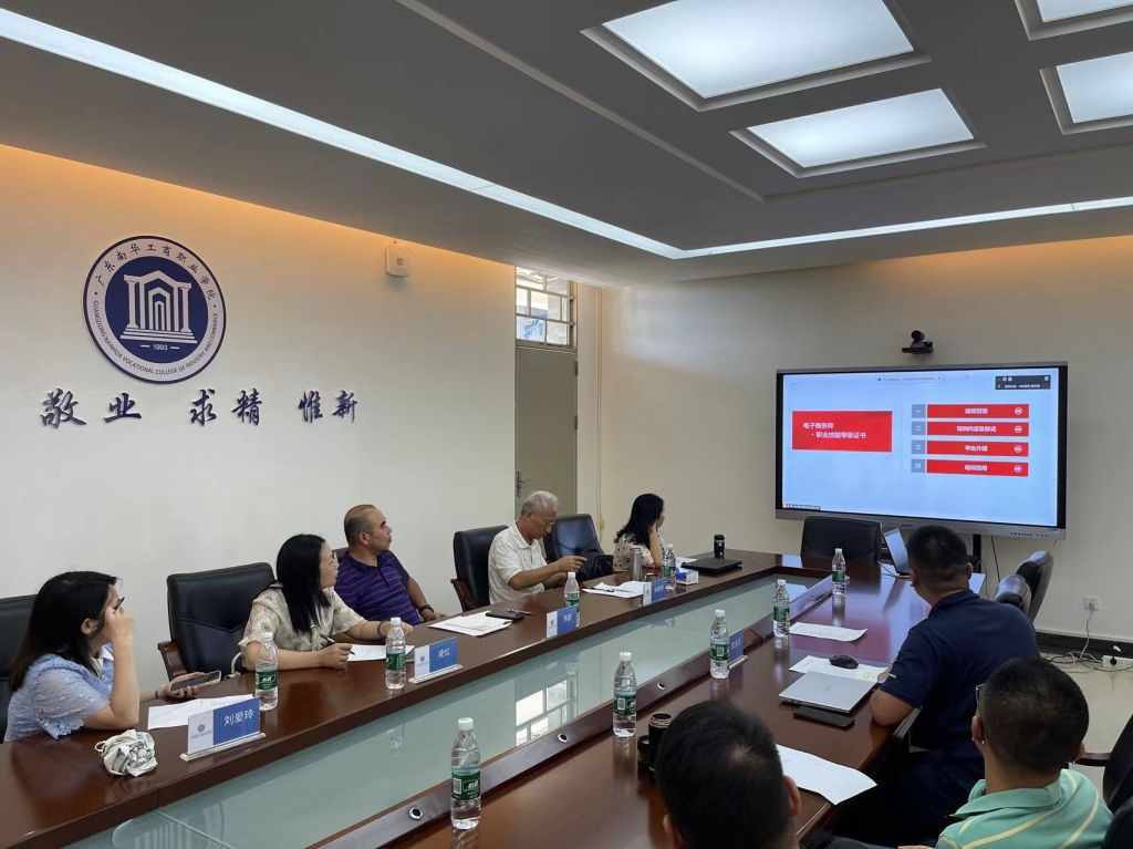中教畅享科技股份有限公司广东省培训评价中心区域经理李洪川,华南电商产业科技(深圳)有限公司董事长朱加宝,学校党委委员、外语外贸学院院长李新,广东工匠学院副院长凌红,外语外贸学院党总支部副书记刘爱玲、常务副院长杨鹏强、综合办公室主任张国林、相关专业负责人及专任教师参加会议。