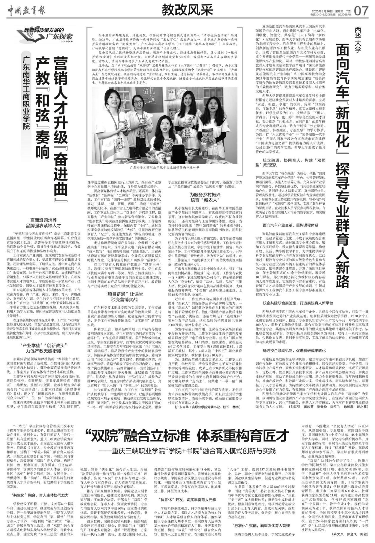 近年来,在广东省职业教育“双师型”名教师林海工作室(以下简称“工作室”)引领下,南华工商职院与广东科学技术职业学院等院校以市场需求为导向,让课程在重构中“无缝对接”企业项目,“产教共生”生态欣欣向荣。校企创新构建的“资源联通、项目贯通、进阶畅通”培养体系,不但让师生在真实商业场景中锤炼数字营销硬实力,而且孵化出数十个助农IP。随着更多传统农特产品在云端市场焕发新生,乡村振兴画卷上也呈现出更多亮色。