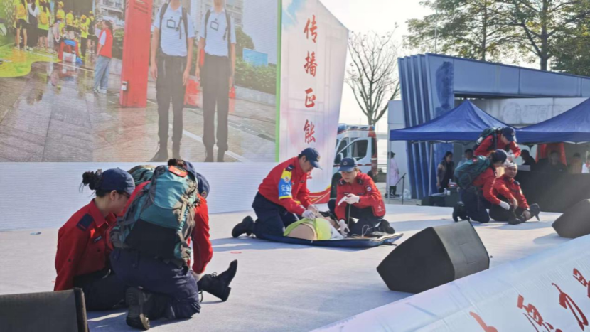 急救演习与志愿者分享同步开展。市急救中心专业人员模拟“意外跌倒”的场景,详解心肺复苏、伤口止血等急救技能,志愿者分组实操,在专业指导下快速掌握要领。