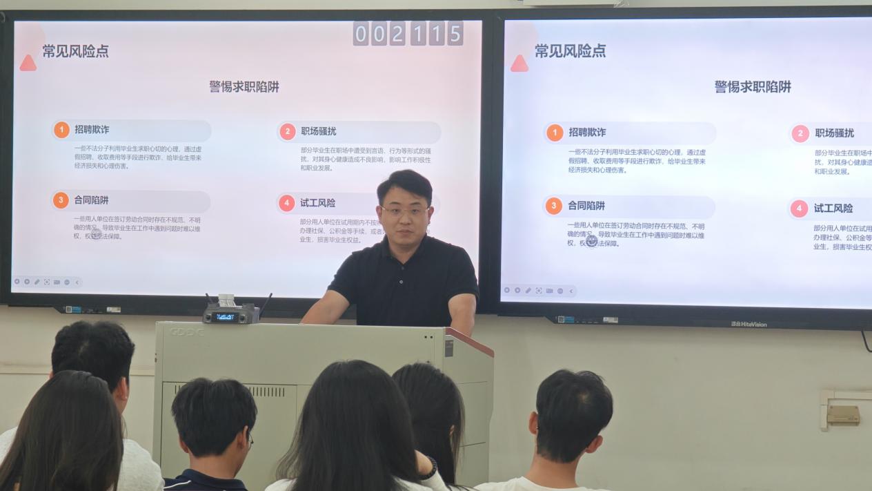 结合多年执业经验与典型案例,黄律师围绕求职全流程系统梳理法律风险要点,拆解毕业生需高度警惕的四大求职陷阱。从招聘欺诈的隐蔽套路、职场性骚扰的界定与应对,到劳动合同中的常见“霸王条款”、试工期间的权益保障盲区,均通过“案例拆解+法律条文对照”的方式,让抽象的法律知识变得通俗易懂。针对当下个人信息泄露高发问题,他还详解网络诈骗诱导、恶意软件窃取、社交媒体信息公开不当三大泄露途径,引导毕业生在求职过程中提高警惕,做好个人信息保护。