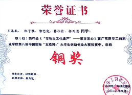 2021-2022学年,获第八届中国国际“互联网+”大学生创新创业大赛广东南华工商职业学院铜奖;