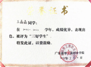 2021-2022学年,获广东南华工商职业学院“三好学生”称号;