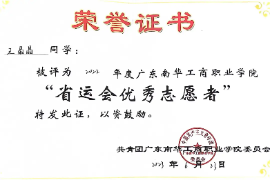 2022-2023年度,获广东南华工商职业学院“省运会优秀志愿者”称号。