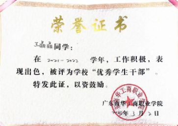 2021-2022学年,获广东南华工商职业学院“优秀学生干部”称号;