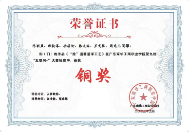 2022-2023学年,获《“拾”遗非遗手工艺》广东南华工商职业学院第九届“互联网+”大赛铜奖 ;