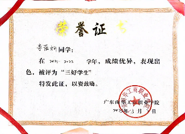 2021-2022学年,获广东南华工商职业学院“三好学生”称号;