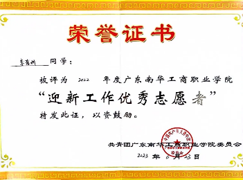 2022-2023学年,获广东南华工商职业学院“迎新工作优秀志愿者”称号;