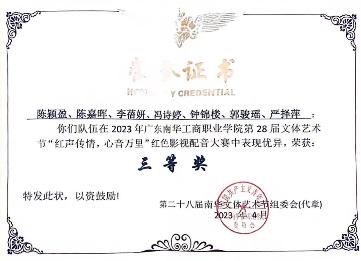 2022-2023学年,获广东南华工商职业学院第 28 届文体艺术节“红声传情,心音万里”红色影视配音大赛三等奖;