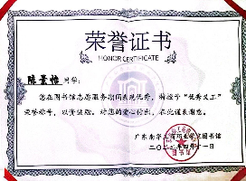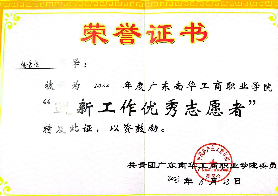 2021-2022学年,获广东南华工商职业学院图书馆“优秀义工”荣誉称号。