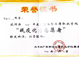 2022-2023学年,获广东南华工商职业学院“战疫优秀志愿者”称号;