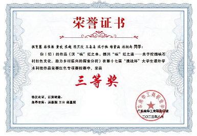 2022-2023学年,获第十七届“挑战杯”大学生课外学术科技作品竞赛红色专项赛广东南华工商职业学院三等奖;