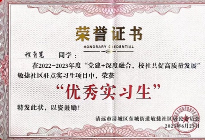 2022-2023学年,获“党建+深度融合,校社共促高质量发展”敏捷社区驻点实习生项目中“优秀实习生”称号。