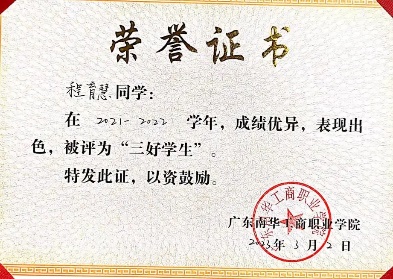 2021-2022学年,获广东南华工商职业学院“三好学生”称号;