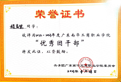 2022-2023学年,获广东南华工商职业学院“优秀团干部”称号;