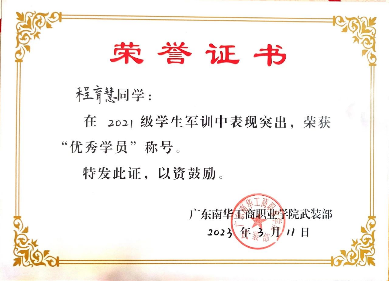 2022-2023学年,获广东南华工商职业学院2021级军训“优秀学员”称号;