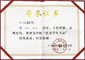 2022-2023年,获广东南华工商职业学院“优秀学生干部”称号;