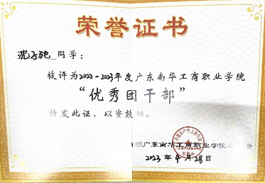 2022-2023年,获广东南华工商职业学院“优秀团干部”称号;