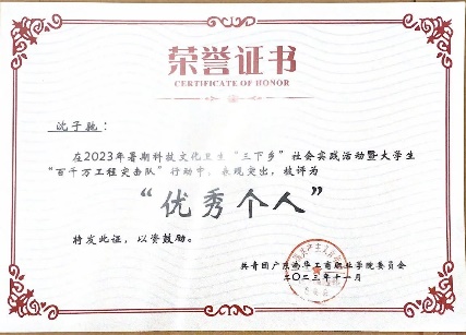 2022-2023学年,获广东南华工商职业学院暑期“三下乡”社会实践活动暨“百千万工程突击队”行动“优秀个人”称号。