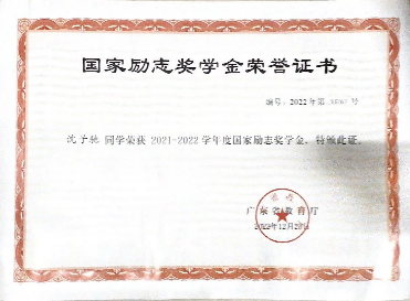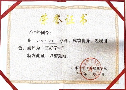 2021-2022学年,获广东南华工商职业学院“三好学生”称号;