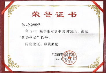 2022-2023年,获广东南华工商职业学院2021级军训“优秀学员”称号;