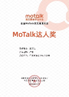 2022-2023学年,获全国MoTalk英文晨读大赛MoTalk达人奖;